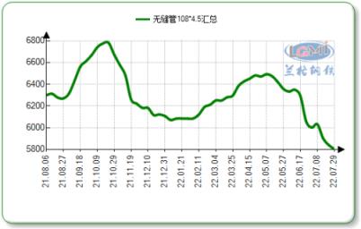 據(jù)云商平臺(tái)監(jiān)測(cè)數(shù)據(jù)顯示:截至7月29日,國(guó)內(nèi)十大主導(dǎo)城市108*4.5無(wú)縫管市場(chǎng)均價(jià)5805元,較上月同期跌205元。