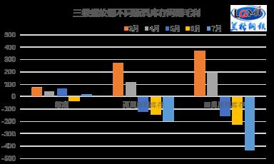 7月份由于原料庫存周期不同,成本下降幅度有明顯差異,厚壁鋼管市場均值震蕩下行,7月份品種噸鋼毛利相比上月表現(xiàn)分化。以三級(jí)螺紋鋼為例,以即期原料成本測算7月份毛利空間較上月上升49元/噸,由虧轉(zhuǎn)盈;而以兩周、四周原料庫存周期測算7月份毛利空間均在虧損區(qū)間繼續(xù)下行,兩周原料庫存周期測算虧損幅度較上月擴(kuò)大53元/噸,以四周原料庫存周期測算7月份虧損空間較上月擴(kuò)大206元/噸(詳見圖2)。