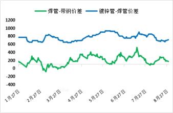 8月焊鍍管與原料價差收縮173元(詳見圖2)。焊管生產(chǎn)利潤一度虧損百元左右,繼續(xù)出現(xiàn)停購原料2-3天的情況;鍍鋅管生產(chǎn)利潤相對抗跌,整體處于虧損邊緣。結(jié)算周期內(nèi)焊管生產(chǎn)利潤核算平均盈利12元,鍍鋅管生產(chǎn)利潤核算平均盈利57元。